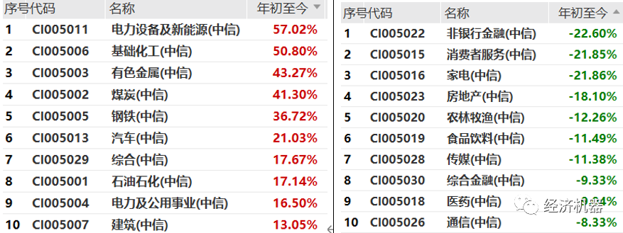 圖2、中信一級行業:漲幅前十和跌幅前十