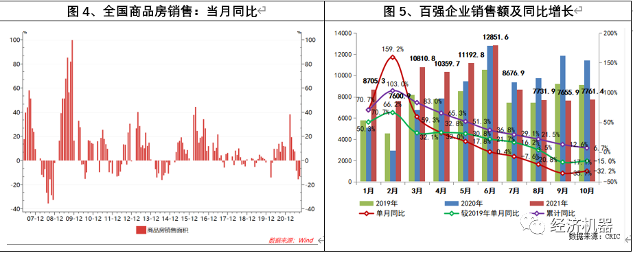 1)房地產銷售持續下滑。9月份全國商品房銷售面積當月同比下跌13.2%,連續3個月同比負增長;百強企業銷售額10月份同比上年下降32.2%,絕對金額連續3個月環比回落。