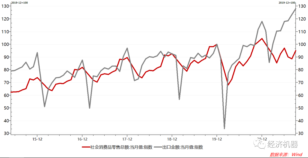 圖8:消費復蘇遠遠落戶于出口復蘇,且復蘇近期中止