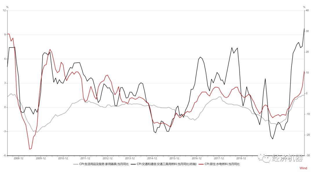 非食品通脹方面,電價在工商企業上浮比例大幅提高,尤其是對高耗能企業用電完全放開,將會推升工商業成本。用電成本在工業中處于最基礎的地位,類似于糧食在農業中的作用,用電成本上升,將會加速向終端消費傳導。目前水電燃料和家電類漲價跡象明顯。此外,由于國際原油價格上漲,最近交通燃料分項同比大幅上漲,幅度超過20%(圖17)。