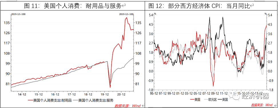 • 海外需求沖擊帶來的輸入性通脹。疫情期間,以美國為首的西方國家推出了大力度的財政刺激措施,包括向民眾派發現金,導致居民儲蓄率和購買力大幅提高。隨著疫苗接種,需求領先于供給而恢復,耐用消費品需求更是出現“井噴”,速度遠快于服務消費(圖11),加劇了其國內的大通脹(圖12)。由于耐用品多屬于貿易品,通過國際貿易形式,向我國輸入了通脹壓力。