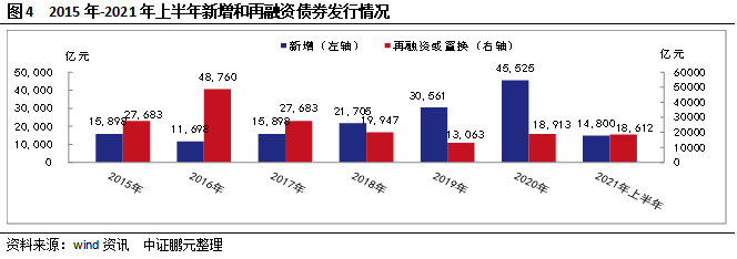 2021年上半年,受到專項(xiàng)債券發(fā)行進(jìn)度放緩的影響,新增債券規(guī)模大幅下降;在新增債券規(guī)模下降之下,再融資債券規(guī)模大幅上升,這既是地方財(cái)政緩解借新還舊壓力的需要,也反映出專項(xiàng)債券償還機(jī)制不健全、不成熟。上半年,新增債券發(fā)行427只,同比下降53.69%,發(fā)行規(guī)模14,799.81億元,同比下降46.89%,其中新增一般債券4,656.46億元,新增專項(xiàng)債券10,143.34億元;再融資債券發(fā)行228只,同比上升132.65%,發(fā)行規(guī)模18,611.63億元,同比上升166.05%,其中再融資一般債券11,446.79億元,再融資專項(xiàng)債券7,164.85億元。2021年新增一般債券限額為8,000億元,上半年完成一般債券新增額度的58.21%,新增專項(xiàng)債券限額為34,676億元,上半年完成專項(xiàng)債券新增額度的29.25%。2021年地方債到期償還規(guī)模為26,659.36億元,同比上升28.50%,上半年再融資債券占全年到期償還額之比為69.81%。