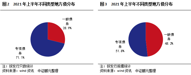 2021年上半年,一般債券發(fā)行只數(shù)和規(guī)模同比均出現(xiàn)上升,由于監(jiān)管層對(duì)專項(xiàng)債項(xiàng)目審核趨嚴(yán),專項(xiàng)債券發(fā)行只數(shù)和規(guī)模均出現(xiàn)下降。上半年,地方債一般債券共發(fā)行189只,同比上升33.1%,占上半年地方債發(fā)行之比為28.85%,發(fā)行規(guī)模16,103.25億元,同比上升44.57%,占比48.2%;專項(xiàng)債券466只,同比下降46.92%,占比71.15%,發(fā)行規(guī)模17,308.19億元,同比下降27.05%,占比51.8%。