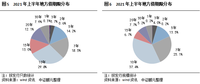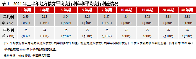 1、上半年發(fā)行利率整體有所下行。2021年上半年地方債發(fā)行利率在2.59%到3.98%之間,平均發(fā)行利率為3.48%,較2020年下半年3.59%的平均發(fā)行利率下行超過(guò)11BP,主要是受地方債期限縮短因素的影響。具體來(lái)看,3年期為3.04%,下行5BP;5年期為3.23%,上行5BP;7年期為3.37%,下行1BP;10年期為3.4%,上行6BP;15年期為3.72%,下行5BP;20年期為3.84%,下行6BP;30年期為3.88%,下行16BP。