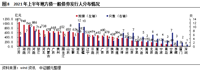 從債券類型來(lái)看,上半年一般債券發(fā)行只數(shù)以湖北居首,共發(fā)行了12只,其次為四川和新疆,各發(fā)行10只,發(fā)行規(guī)模居前三位的省份為江蘇、湖南和四川,規(guī)模分別為1,070.63億元、947.51億元和940.81億元;專項(xiàng)債券發(fā)行只數(shù)居前三位的省份為廣東、湖北和山東,分別為55只、41只和28只,發(fā)行規(guī)模居前三位的省份為廣東、山東和四川,規(guī)模分別為1,663.82億元、1,617.60億元和1,213.97億元。