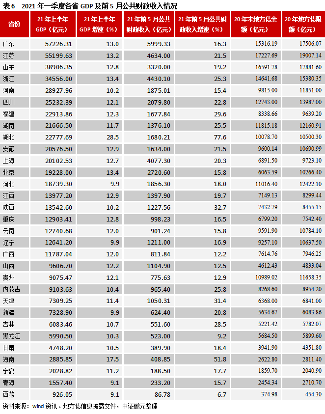 從各省已公布的前5月公共財(cái)政收入來(lái)看,除西藏和黑龍江是個(gè)位數(shù)增長(zhǎng)外,其他省份均為兩位數(shù)增長(zhǎng),從兩年復(fù)合增長(zhǎng)率來(lái)看,山西、重慶和黑龍江均為負(fù)增長(zhǎng)。具體來(lái)看,21年前5月地方公共財(cái)政收入規(guī)模排在前三位的省份為廣東、江蘇和浙江,分別為5,999.33億元、4,634.00億元、4,430.10億元,排在最后三位的省份仍然為西藏、寧夏、青海,分別為86.78億元、188.50億元、233.20億元。地方公共財(cái)政收入同比增速最高的省份為湖北,增長(zhǎng)77.6%,其次為海南,增長(zhǎng)51.8%,再者為陜西,增長(zhǎng)32.7%,增速排在最后三位的省份為西藏、黑龍江和廣西,分別為6.7%、9.2%和12.2%。按兩年平均增長(zhǎng)率來(lái)看,地方公共財(cái)政收入增速最高的省份為青海,增長(zhǎng)39.59%,其次為浙江,增長(zhǎng)10.34%,再者為福建,增長(zhǎng)8.08%,增速排在最后三位的省份為山西、黑龍江和重慶,分別為-3.44%、-3.33%和-0.62%。