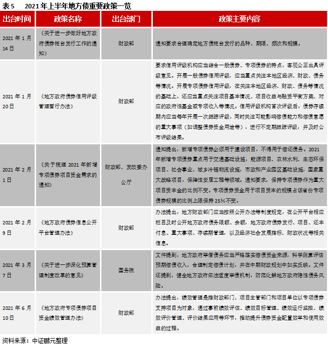 2020年上半年地方政府債券相關(guān)政策主要圍繞三個(gè)方面展開,一是繼續(xù)從政策層面完善地方政府債務(wù)管理制度,政策文件主要是國(guó)務(wù)院出臺(tái)的《關(guān)于進(jìn)一步深化預(yù)算管理制度改革的意見(jiàn)》(國(guó)發(fā)〔2021〕5號(hào)),文件提出,一方面,健全地方政府依法適度舉債機(jī)制,健全地方政府債務(wù)限額確定機(jī)制,完善專項(xiàng)債券管理機(jī)制等;另一方面,防范化解地方政府隱性債務(wù)風(fēng)險(xiǎn),堅(jiān)決遏制隱性債務(wù)增量,妥善處置和化解隱性債務(wù)存量,完善常態(tài)化監(jiān)控機(jī)制,加強(qiáng)督查審計(jì)問(wèn)責(zé)。二是繼續(xù)深入對(duì)具體的地方政府債券管理工作進(jìn)行規(guī)范,主要包括地方政府債券柜臺(tái)發(fā)行、信用評(píng)級(jí)、信息公開平臺(tái)管理和專項(xiàng)債券項(xiàng)目績(jī)效管理等方面;三是指導(dǎo)2021年地方政府專項(xiàng)債發(fā)行工作,政策文件主要是財(cái)政部、發(fā)改委聯(lián)合下達(dá)的《關(guān)于梳理2021年新增專項(xiàng)債券項(xiàng)目資金需求的通知》,該通知就2021年地方政府專項(xiàng)債項(xiàng)目報(bào)送方式、投向領(lǐng)域、項(xiàng)目要求、重大項(xiàng)目資本金比例等問(wèn)題做出了相應(yīng)規(guī)定。