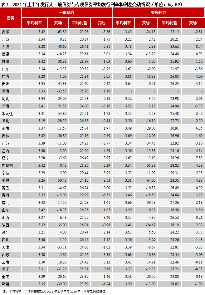 5、除云南和河南,一般債券和專項(xiàng)債券平均發(fā)行利率均以下行為主。2021年上半年,地方債一般債券發(fā)行人平均發(fā)行利率最高的為山東、安徽、吉林、甘肅、內(nèi)蒙古、廈門,均為3.42%;平均發(fā)行利率最低的為湖北,為3.19%,其次深圳,為3.21%,再者寧夏,為3.26%。地方債專項(xiàng)債券發(fā)行人平均發(fā)行利率最高的為廣西,為3.81%,其次為大連,為3.78%,再者為吉林,為3.69%;平均發(fā)行利率最低的為北京,為3.22%,其次寧夏,為3.31%,再者江蘇,為3.34%。2021年上半年,地方債一般債券發(fā)行人平均利差最高的為青海,為29.89BP,其次為寧波,為29.44BP,再者甘肅,為28.99BP,最低的為北京,為20.34BP,其次廣東,為20.52BP,再者深圳,為20.94BP;專項(xiàng)債券平均利差最高的為青海,為34.64BP,其次大連,為33.62BP,再者為湖南,為30.91BP,最低的為北京,為20.21BP,其次廣東,為21.97BP,再者云南,為22.46BP。2021年上半年,吉林、大連等地發(fā)行利率較高,同時(shí),市場(chǎng)給青海等地的溢價(jià)高于平均水平,更多的是對(duì)這些地方經(jīng)濟(jì)財(cái)政基本面的反映。