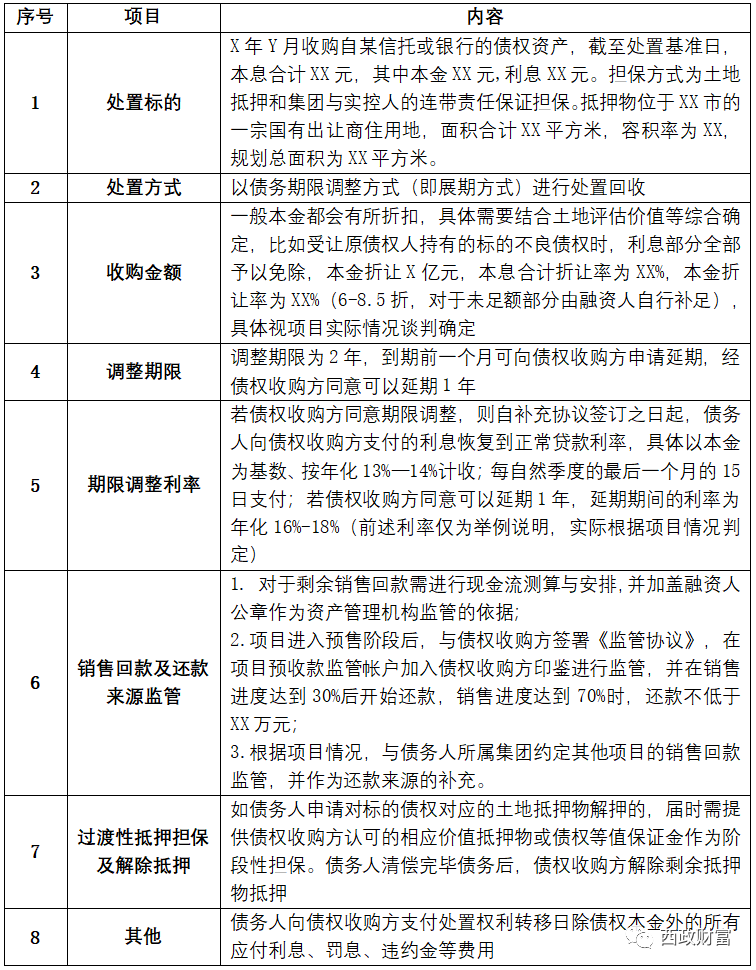 資產(chǎn)管理公司打折收購(gòu)銀行、信托等機(jī)構(gòu)對(duì)開發(fā)商的到期債權(quán)是不良處置業(yè)務(wù)的常見模式,資產(chǎn)管理公司收購(gòu)債權(quán)后的處置方案中,債務(wù)期限調(diào)整、訴訟清收以及公開轉(zhuǎn)讓是最常見的三種方式。其中,資產(chǎn)管理公司收購(gòu)到期債權(quán)后給予債務(wù)人展期是最常規(guī)的債務(wù)處置思路,在該操作過程中,由資產(chǎn)管理機(jī)構(gòu)打折(6折-8.5折,具體一事一議)收購(gòu)銀行或信托等金融機(jī)構(gòu)對(duì)開發(fā)商的到期債權(quán),對(duì)于債務(wù)人有強(qiáng)烈的期限調(diào)整意向,并愿意按照一定年利率向債權(quán)收購(gòu)方支付利息的,資產(chǎn)管理公司一般都會(huì)準(zhǔn)予債務(wù)人在兩年內(nèi)或約定時(shí)間內(nèi)清償全部債務(wù)。此外,考慮到抵押物的位置較為優(yōu)越以及抵押率較為理想的情況下,在資產(chǎn)管理機(jī)構(gòu)(債權(quán)收購(gòu)方)認(rèn)為抵押物具備變現(xiàn)能力的情況下,一般都可給予該債務(wù)一定的寬限期。具體融資要素示例如下: