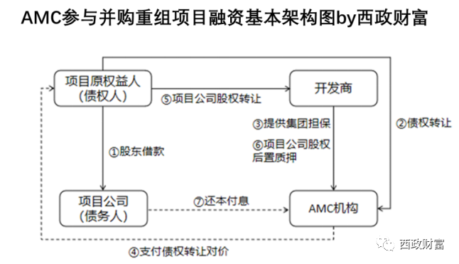 AMC參與并購(gòu)重組項(xiàng)目融資主要是通過收購(gòu)項(xiàng)目原權(quán)益人或其關(guān)聯(lián)方/非關(guān)聯(lián)方對(duì)項(xiàng)目公司的債權(quán),實(shí)現(xiàn)開發(fā)商(收購(gòu)方)對(duì)項(xiàng)目并購(gòu)款的支付,進(jìn)而完成項(xiàng)目收并購(gòu)資金的撬動(dòng)。相關(guān)交易架構(gòu)及交易流程如下: