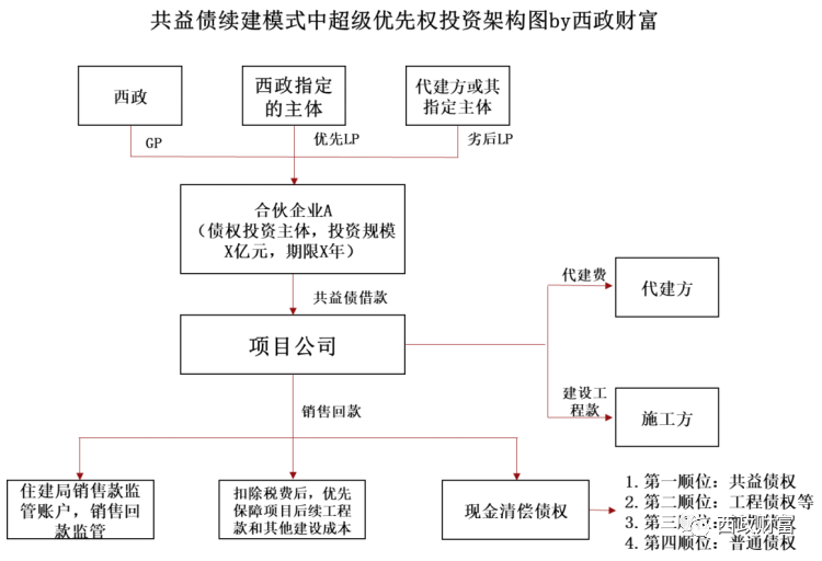 (1) 投資架構(gòu): 西政(GP)與其指定的主體(優(yōu)先級(jí)LP)及代建方或其指定的主體(劣后級(jí)LP)共同成立合伙企業(yè)A作為超級(jí)優(yōu)先權(quán)投資主體,優(yōu)先級(jí)LP和劣后級(jí)LP按7:3的比例出資,總出資額度不超過約定金額。