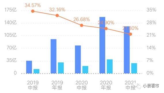 業(yè)績下降的同時,德信中國的盈利能力也在下滑,2021年上半年其毛利率為21.8%,同比下降4.88個百分點。