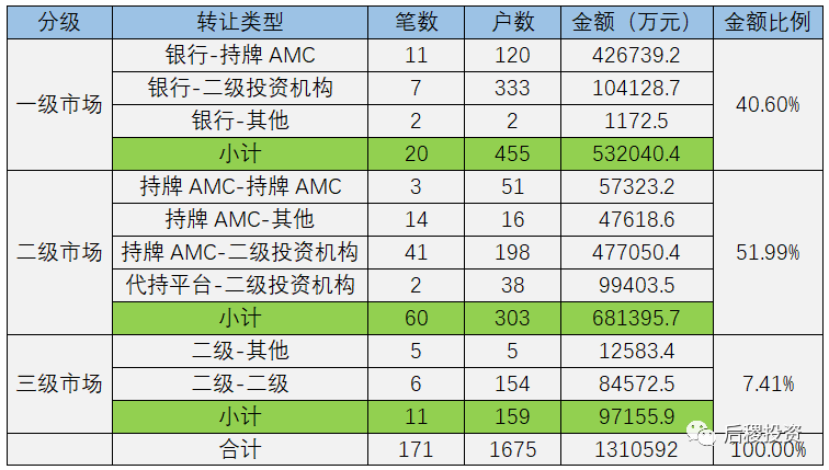 按慣例,我們將行業(yè)市場分為三級:銀行出讓債權(quán)為一級市場;本地持牌AMC或代持機(jī)構(gòu)在當(dāng)?shù)爻鲎寕鶛?quán)為二級市場,其余的債權(quán)轉(zhuǎn)讓為三級市場。