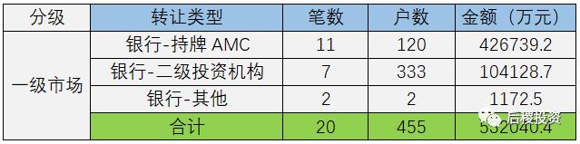根據(jù)已有數(shù)據(jù)顯示,一級市場總成交455戶,總成交金額約53億余元,成交規(guī)模最大的為銀行-持牌AMC,成交金額在一級市場中占80.9%。對比18年,一級市場出讓總額減少約8億元,其中銀行-持牌AMC出讓金額減少15億元;銀行-二級投資機(jī)構(gòu)出讓金額增加8億元。