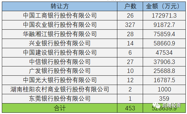 從上圖看,工商銀行出讓金額遙遙領(lǐng)先,其出讓金額是農(nóng)業(yè)銀行與湘江銀行的總和,大型國有銀行中,工行、建行進(jìn)入榜單前五,但出讓金額與其他銀行相差不大。