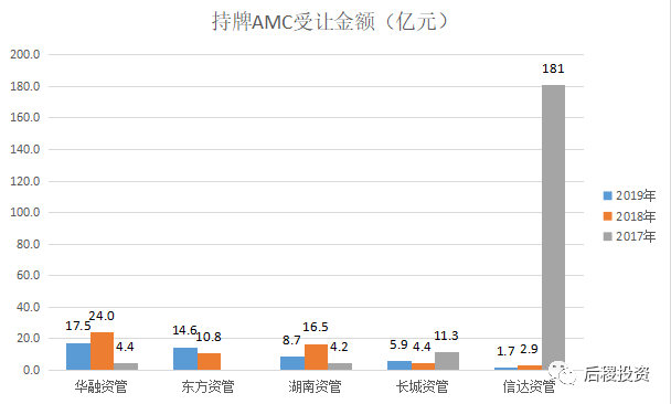 從年份上看,17年持牌AMC受讓銀行資產(chǎn)體量最大,其中以信達(dá)資管為最,17年信達(dá)受讓181億元,占當(dāng)年一級市場受讓方83%;從個體上看,也是信達(dá)資管表現(xiàn)最為亮眼,經(jīng)歷17年大規(guī)模受讓債權(quán)后,18、19兩年受讓金額大幅度下降,幾近為零,華融資管與湖南資管都是18年受讓金額明顯增加,17、19年相較平穩(wěn),東方資管受讓金額逐年增加。