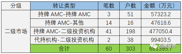 根據(jù)已有數(shù)據(jù)顯示,二級市場總成交303戶,總成交金額68億余元。成交規(guī)模最大的為持牌AMC-二級投資機(jī)構(gòu),成交金額在二級市場中占70%。對比18年,二級市場總量增加約23億元,其中持牌AMC-二級投資機(jī)構(gòu)增加17億元;持牌AMC-其他減少10億元;代持平臺-二級投資機(jī)構(gòu)增加8億元。