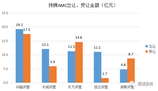對比2018年,2019年持牌AMC總出讓金額增加約15億元,總受讓金額減少約18億元。華融資管、長城資管、信達(dá)資管出讓金額大于受讓金額,東方資管、湖南資管出讓金額小于受讓金額。