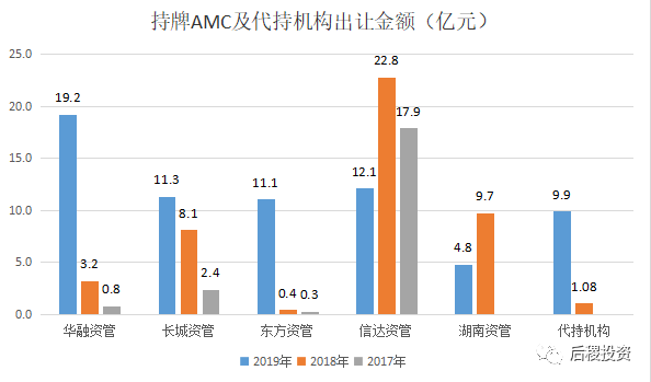 二級市場中,華融資管、長城資管與東方資管出讓金額逐年遞增,信達(dá)資管經(jīng)過17、18年釋放大量庫存后,19年出讓金額明顯下滑,相比18年,湖南資管19年出讓金額減少約5億元,代持機(jī)構(gòu)出讓金額增加約9億元。