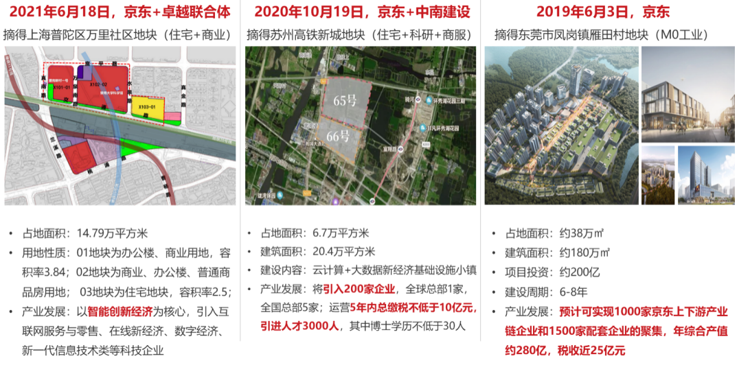2021年6月,京東和卓越形成的聯(lián)合體以99.1億元成功摘得上海普陀區(qū)萬(wàn)里社區(qū)地塊,該項(xiàng)目由3個(gè)地塊組成,其中X101-01地塊為辦公、商業(yè)用地,容積率3.84;X101-02地塊為商業(yè)、辦公、普通商品房用地,項(xiàng)目將以智能創(chuàng)新經(jīng)濟(jì)為核心,引入互聯(lián)網(wǎng)服務(wù)與零售、在線(xiàn)新經(jīng)濟(jì)、數(shù)字經(jīng)濟(jì)、新一代信息技術(shù)類(lèi)等科技企業(yè)。