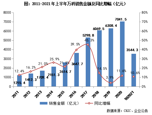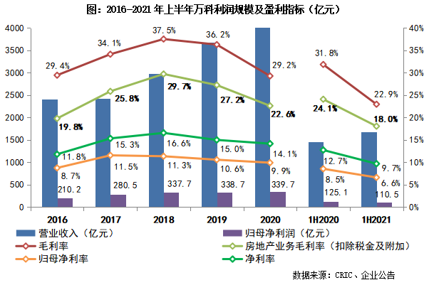 2021年上半年,萬科實現營業收入1671.1億元,同比增長14.2%,其中來自房地產業務的結算收入1575.3億元。毛利潤383.4億元、凈利潤161.7億元、歸母凈利潤110.5億元,雖然萬科上半年營收規模保持增長,但結轉利潤規模均同比降低逾11%。