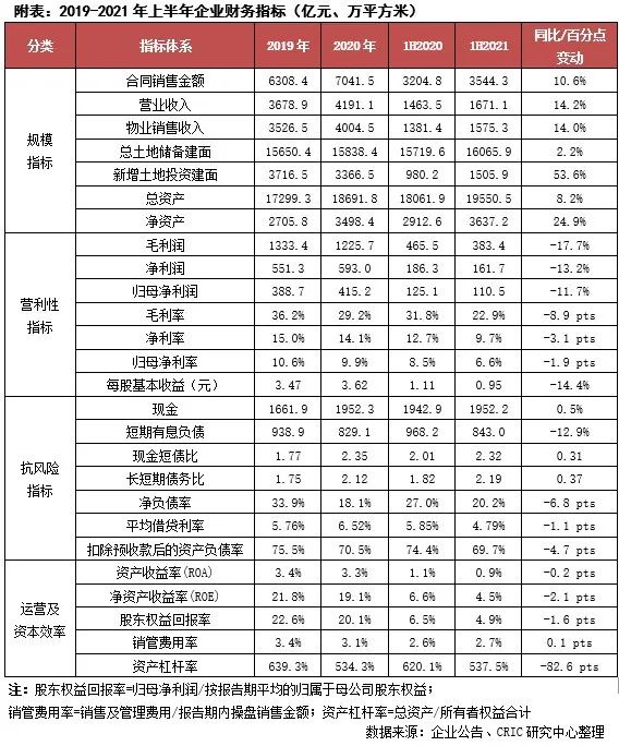 【盈利指標回落至歷史低位,三道紅線綠檔達標】2021年上半年,萬科實現營業收入1671.1億元,同比增長14.2%。雖然營收規模保持增長,但盈利下行壓力較大,上半年結算利潤規模同比降低逾11%,各項盈利指標也均回落至歷史低位。截至上半年末萬科現金短債比2.32、凈負債率20.2%、扣除預收款項的資產負債率69.7%,財務持續穩健、滿足“三道紅線”綠檔要求。