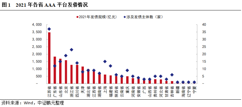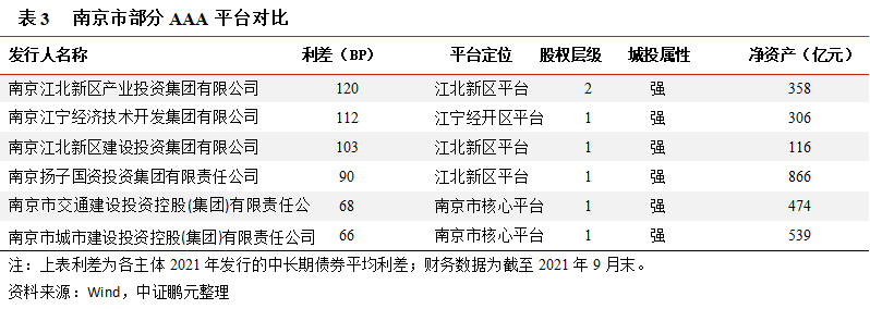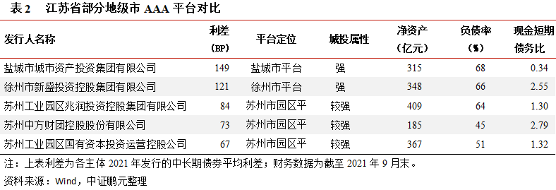 對(duì)于經(jīng)濟(jì)發(fā)達(dá)省份,市場(chǎng)偏好的AAA平臺(tái)所在區(qū)域的行政層級(jí)已下沉至區(qū)縣甚至市級(jí)園區(qū)。如江蘇省作為發(fā)債大省,2021年共有37家AAA發(fā)債主體,主體數(shù)量遙遙領(lǐng)先其他省份,江蘇AAA平臺(tái)大量下沉至區(qū)縣平臺(tái)甚至部分經(jīng)濟(jì)強(qiáng)市的市級(jí)園區(qū)平臺(tái)。37個(gè)平臺(tái)除省級(jí)平臺(tái)外,還包括南京市的8個(gè)市級(jí)平臺(tái)及其下轄的江寧開發(fā)區(qū)、江北新區(qū)等5個(gè)區(qū)級(jí)平臺(tái),經(jīng)濟(jì)強(qiáng)市蘇州、無錫、常州、南通的主要平臺(tái)和蘇州市下屬的3個(gè)工業(yè)園區(qū)平臺(tái),以及鹽城、徐州、揚(yáng)州的核心平臺(tái),昆山、張家港2個(gè)經(jīng)濟(jì)強(qiáng)縣的核心平臺(tái)。整體上,江蘇省AAA平臺(tái)的城投屬性較強(qiáng),凈資產(chǎn)規(guī)模相對(duì)高等級(jí)主體處于一般水平(除兩家凈資產(chǎn)上億的平臺(tái)外,其他35家平臺(tái)平均凈資產(chǎn)規(guī)模350億元、中位數(shù)315億元),平均發(fā)行利差101BP,表現(xiàn)較好。