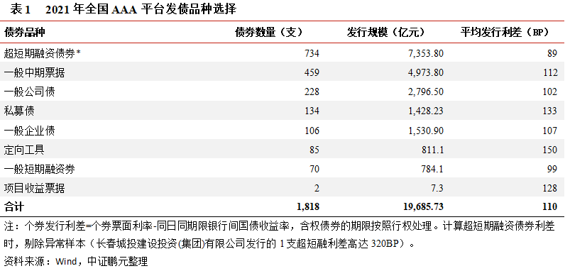 從發(fā)債品種的選擇,超短期融資債券是全國AAA平臺(tái)最主要的發(fā)債品種,發(fā)行支數(shù)和發(fā)行規(guī)模顯著高于其他債券品種;其次是一般中期票據(jù)和一般公司債;再次為私募債和一般企業(yè)債,整體發(fā)行數(shù)和發(fā)行規(guī)模一般,定向工具和一般短期融資券發(fā)行量較少,項(xiàng)目收益票據(jù)極少。從利差看,因短期融資券的發(fā)行期限短導(dǎo)致整體發(fā)行利差低,而私募債和定向工具受資金需求及投資者偏好等影響整體利差偏高。
