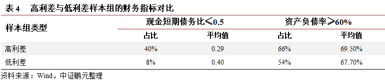 此外,我們通過高利差組(利差最大的前50個(gè)樣本)和低利差組(利差小的后50個(gè)主體)的核心財(cái)務(wù)指標(biāo)進(jìn)行對(duì)比,亦發(fā)現(xiàn)兩個(gè)樣本組在資產(chǎn)負(fù)債率方面的差異性并不顯著,但在現(xiàn)金短期債務(wù)指標(biāo)上有一定差異,即高利差組中低現(xiàn)金短期債務(wù)比的樣本明顯多于低利差組。高利差樣本組中占比40%的樣本現(xiàn)金短期債務(wù)比低于0.5,平均值僅為0.29;而低利差組僅8%的樣本現(xiàn)金短期債務(wù)比低于0.5,且平均值達(dá)0.40,未來高風(fēng)險(xiǎn)區(qū)域的AAA平臺(tái),其短期償債債能力指標(biāo)值得關(guān)注。