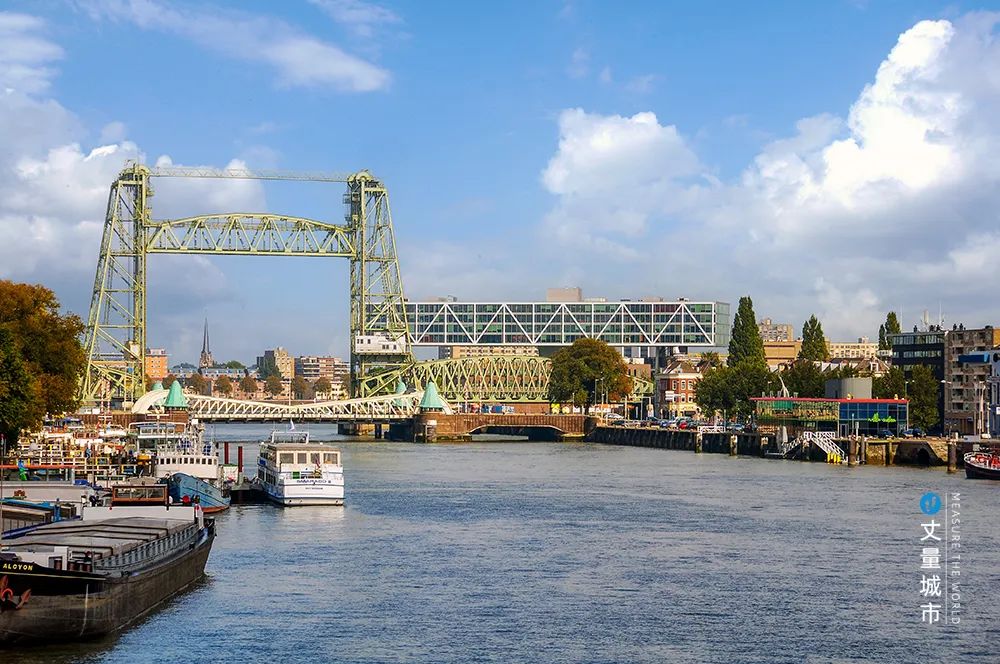 其中最具代表的橋梁當屬1966年竣工完成的伊拉斯謨橋,該橋長802米,高136米,橋身白色鈍角的造型優美且富有張力,宛若屹立于馬斯河上的高貴白天鵝。