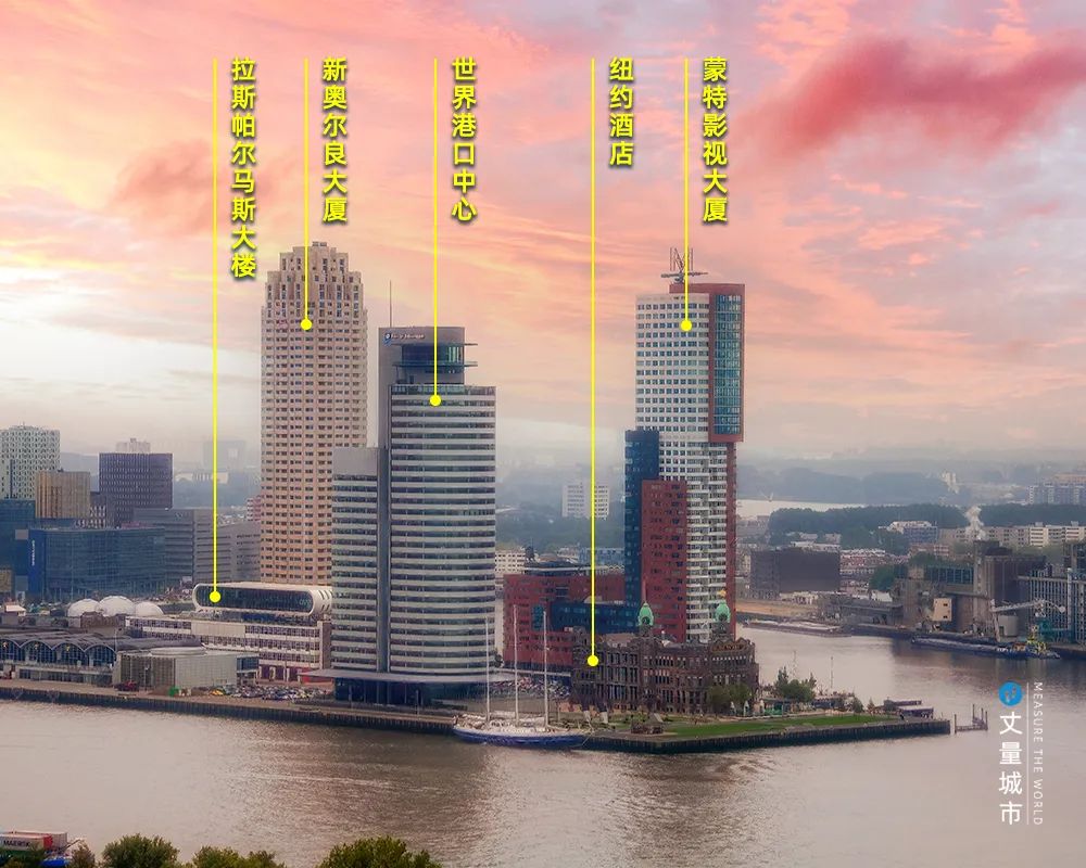 南岸的最美城市天際線,由多位知名建筑師明星作品的集成。如世界港口中心,由諾曼·福斯特設計、鹿特丹大廈出自雷姆·庫哈斯之手、蒙特影視大廈,來自法蘭馨·侯本。