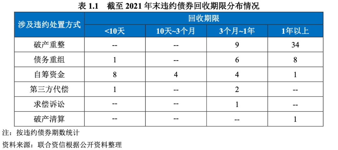 截至2021年末,我國(guó)公募債券市場(chǎng)共有427期債券構(gòu)成實(shí)質(zhì)性違約[3],違約規(guī)模[4]合計(jì)4203.57億元。從違約債券回收情況來(lái)看,截至2021年末,我國(guó)公募債券市場(chǎng)的違約債券共28期實(shí)現(xiàn)全部回收,實(shí)現(xiàn)部分回收[5]的債券有20期;此外,另有14家違約發(fā)行人[6]涉及的43期違約債券已完成或部分完成違約處置,涉及違約規(guī)模491.03億元,但由于信息披露較少等原因無(wú)法獲悉回收規(guī)模(詳見圖1.2)。根據(jù)現(xiàn)階段可獲取的回收規(guī)模數(shù)據(jù)簡(jiǎn)單估算,截至2021年末,公募債券市場(chǎng)整體回收率約為8.63%[7],較2020年末(10.65%)有所下降。從已經(jīng)處置完成[8]的78期違約債券的回收情況來(lái)看,剔除無(wú)法得知回收數(shù)據(jù)的樣本,回收率約為98.98%,較上年(93.91%)有所上升。其中,回收期限為1年以上的債券數(shù)量最多,為44期;其次為3個(gè)月~1年(22期)。從不同處置方式來(lái)看,采用破產(chǎn)重整和債務(wù)重組方式的回收期限仍然較長(zhǎng),自籌資金和第三方代償?shù)然厥諘r(shí)間較短(詳見表1.1)。受到我國(guó)違約回收處置進(jìn)展緩慢、歷時(shí)較長(zhǎng),回收處置的信息披露不完整等因素影響,回收率的簡(jiǎn)單統(tǒng)計(jì)準(zhǔn)確性較低,此外,近年來(lái)我國(guó)破產(chǎn)重整案例不斷增多,重整計(jì)劃中多將債券與其他債權(quán)進(jìn)行合并處置,因此債券的回收金額無(wú)法準(zhǔn)確計(jì)算,也在一定程度上影響回收率統(tǒng)計(jì)的準(zhǔn)確性。