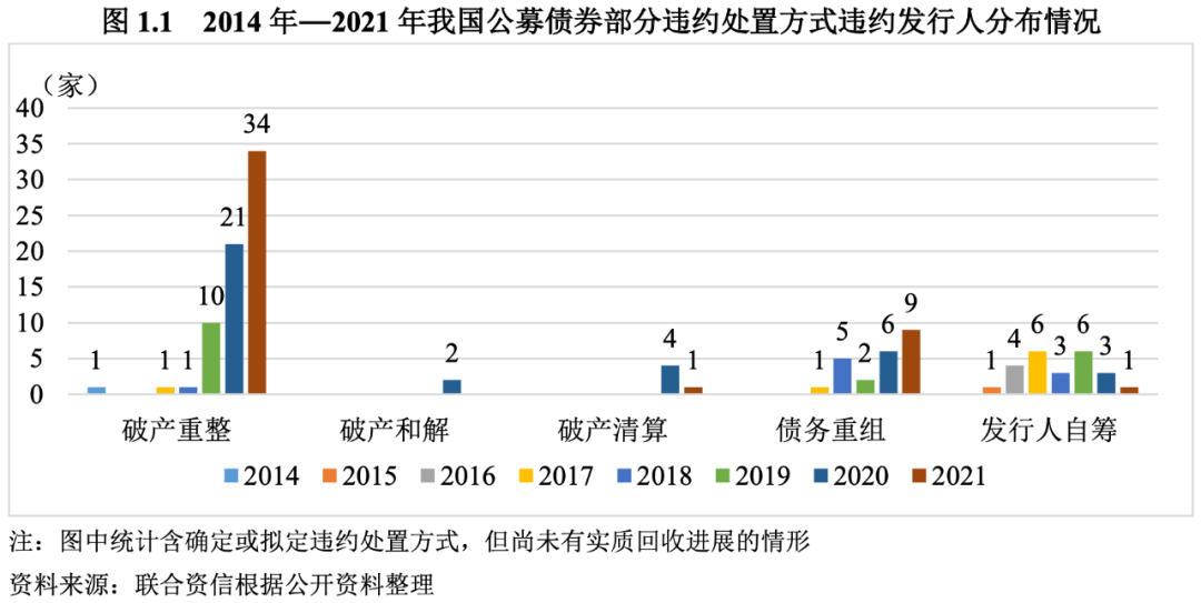2021年共有34家發(fā)行人采用破產(chǎn)重整方式進(jìn)行違約處置,較上年(21家)大幅增加。從破產(chǎn)重整處置效率來(lái)看,自發(fā)行人違約至法院裁定重整、裁定重整至裁定批準(zhǔn)重整計(jì)劃、批準(zhǔn)重整計(jì)劃至重整計(jì)劃執(zhí)行完畢平均耗時(shí)分別為318天、256天和69天,均較2020年有所縮短,破產(chǎn)重整處置效率有所提升;合并重整和預(yù)重整案例進(jìn)一步增加;重整方式更加靈活多樣,出現(xiàn)程序協(xié)同重整與實(shí)質(zhì)合并重整方式相結(jié)合的重整方式;清償方案不斷豐富,多種處置方案靈活搭配,首次出現(xiàn)兜底回購(gòu)?fù)顺鰴C(jī)制的風(fēng)險(xiǎn)處置方案和破產(chǎn)清算轉(zhuǎn)重整案例。