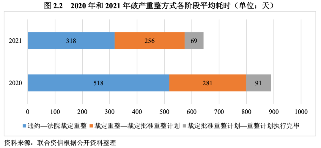 從破產(chǎn)重整處置效率來(lái)看,2021年法院共裁定23家[9]違約發(fā)行人進(jìn)入破產(chǎn)重整程序,其違約日至法院裁定破產(chǎn)重整日的平均耗時(shí)為318天,較2020年(518天)縮短了200天;2021年處于執(zhí)行重整計(jì)劃階段的17家發(fā)行人中,法院裁定重整申請(qǐng)日至批準(zhǔn)重整計(jì)劃日的平均耗時(shí)為256天,較2020年(281天)有所縮短;2021年重整計(jì)劃執(zhí)行完畢的發(fā)行人共2家,其批準(zhǔn)重整計(jì)劃至重整計(jì)劃執(zhí)行完畢平均耗時(shí)69天,較2020年(91天)有所縮短。整體來(lái)看,破產(chǎn)重整處置效率整體較2020年有所提升。