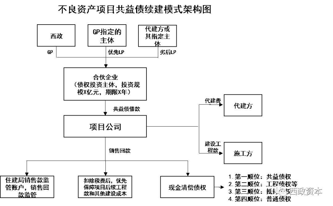 1. 投資架構(gòu):西政(GP)及其指定的主體(優(yōu)先級LP)與代建方或其指定的主體(劣后級LP)共同成立合伙企業(yè),作為不良資產(chǎn)項目的債權(quán)投資主體;優(yōu)先級LP和劣后級LP按7:3的比例出資,總出資額度不超過約定金額。