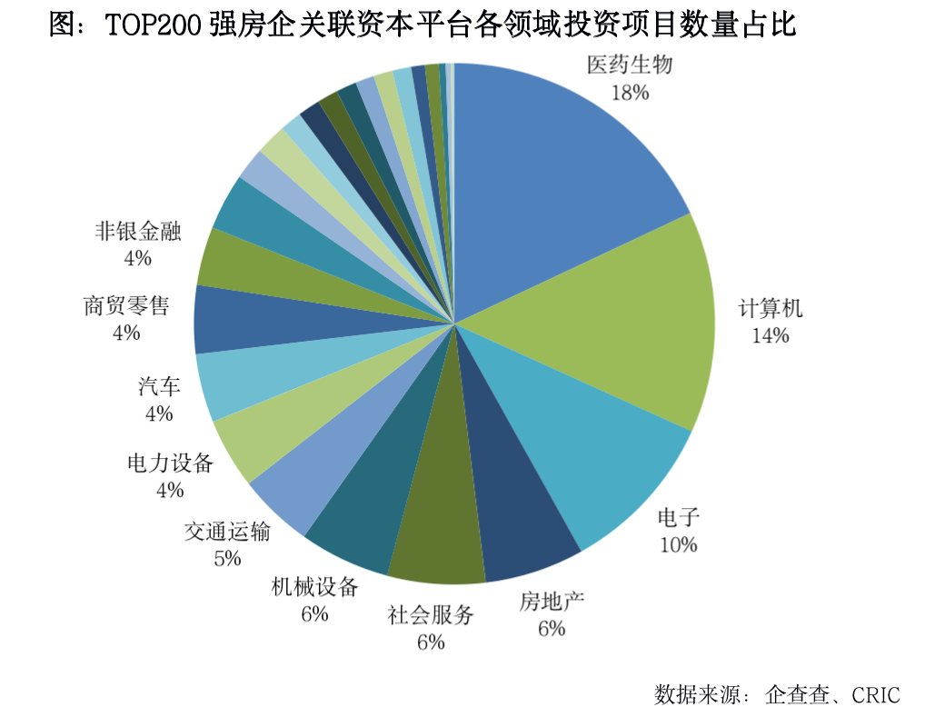 從TOP200強房企關聯資本平臺在各領域的項目投資數量來看,截止2022年2月底,醫藥生物、計算機、電子、房地產、社會服務成為被投最多的前五大行業領域,其中醫藥生物占比18%,為最大行業領域;此外計算機、電子分別占比14%、10%。值得注意的是,在被投項目名稱中“科技”一次被多次提及,在被投項目名稱中包含“科技”字眼的占比達到16%。可見,房企關聯資本平臺更加青睞高科技含量多的行業。