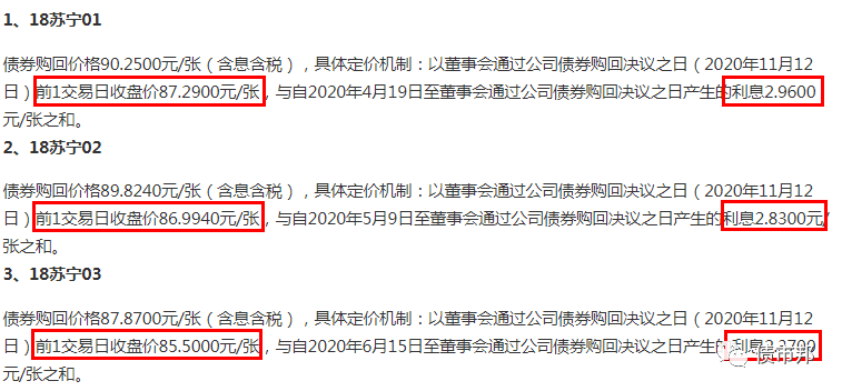 相關債券的回購價格,是11月12號大跌之后的收盤價+應計利息來確定的。以18蘇寧01為例,回購凈價僅為87.29元,也就是說,發行人借了100元的本金,現在只用還87.29元了。