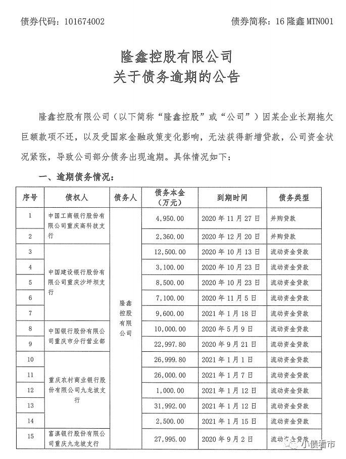 1月20日,隆鑫控股有限公司(以下簡稱“隆鑫控股”)公告稱,公司因某企業長期拖欠巨額款項不還,以及受國家金融政策變化影響,無法獲得新增貸款,公司資金狀況緊張,導致公司部分債務出現逾期,金額合計60.37億元。