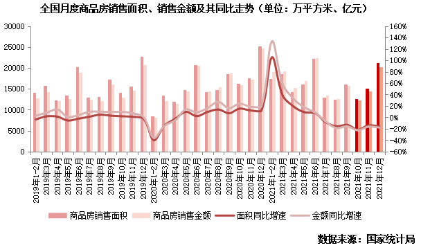 2021年,城市住房需求尤其是改善型住房需求穩(wěn)步釋放,房地產(chǎn)業(yè)增加值比上年增長5.2%,拉動整體經(jīng)濟增長0.4個百分點。但下半年新開工、土地購置和開發(fā)投資均降至冰點,“以價換量”和信貸寬松給予了年末市場一定“數(shù)據(jù)繁榮”。但本輪信貸、融資、土地等各方面調(diào)控暴露出一大部分城市已存在較大購買力透支問題,短期行業(yè)仍將面臨繼續(xù)下行壓力,各地區(qū)銷售分化和降價效用邊際遞減將繼續(xù)保持,預(yù)計商品房銷售規(guī)模在今年一季度仍將下調(diào)筑底過程中。