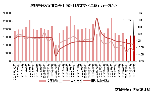 12月全國房屋新開工水平與11月持平,為16075萬平方米。但同比降幅擴大至31%,較11月擴大了10pcts。傳統(tǒng)的“年底開工潮”不再出現(xiàn),進一步表明了民營開發(fā)企業(yè)當(dāng)前仍處于較深困境,銷售回款和融資借款雙雙艱難下,新開工計劃普遍一再取消拖延。