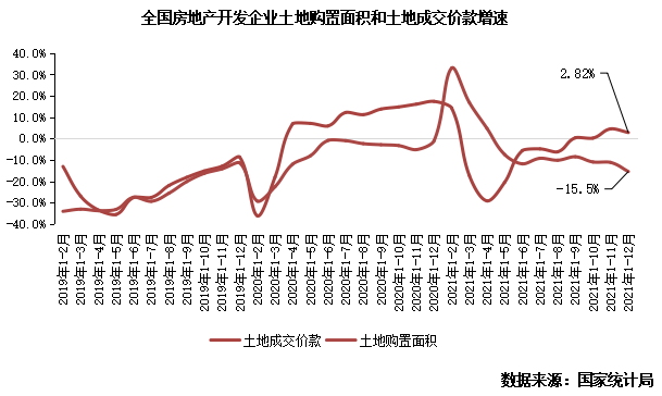 據(jù)國家統(tǒng)計局?jǐn)?shù)據(jù):2021年,房地產(chǎn)開發(fā)企業(yè)土地購置面積2.2億平方米,比上年下降15.5%;土地成交價款1.8萬億元,增長2.8%。單月土地購置面積和成交價款分別為3303萬平方米和3237億元,同比分別下降33%和4%。土地市場已經(jīng)進入到了冰點。房地產(chǎn)資金面收到嚴(yán)控下,民營開發(fā)企業(yè)多已無力購置土地,受此影響下土拓投資已難再支撐整體行業(yè)投資規(guī)模。