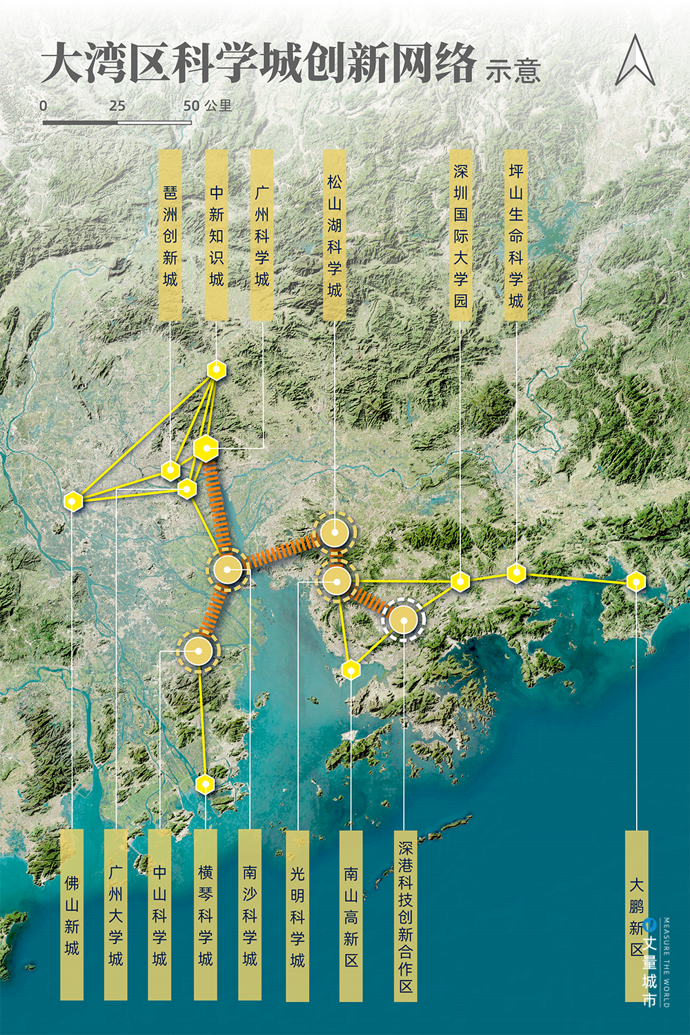 ▼ 大灣區(qū)的科學城與周邊的創(chuàng)新節(jié)點構(gòu)成創(chuàng)新網(wǎng)絡