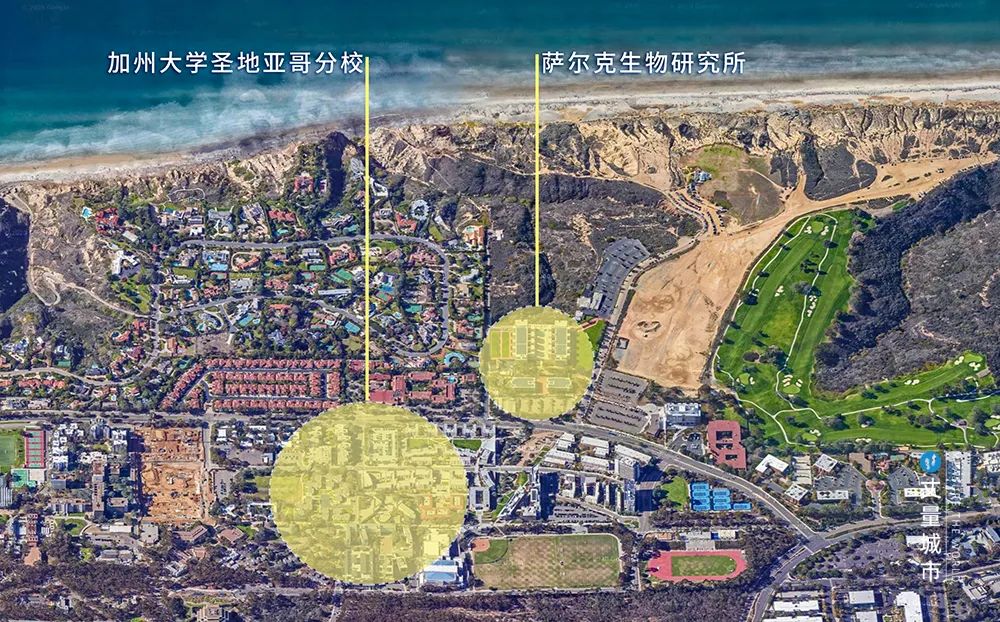 ▼ 薩爾克生物研究所和加州大學圣地亞哥分校的區(qū)位關(guān)系示意