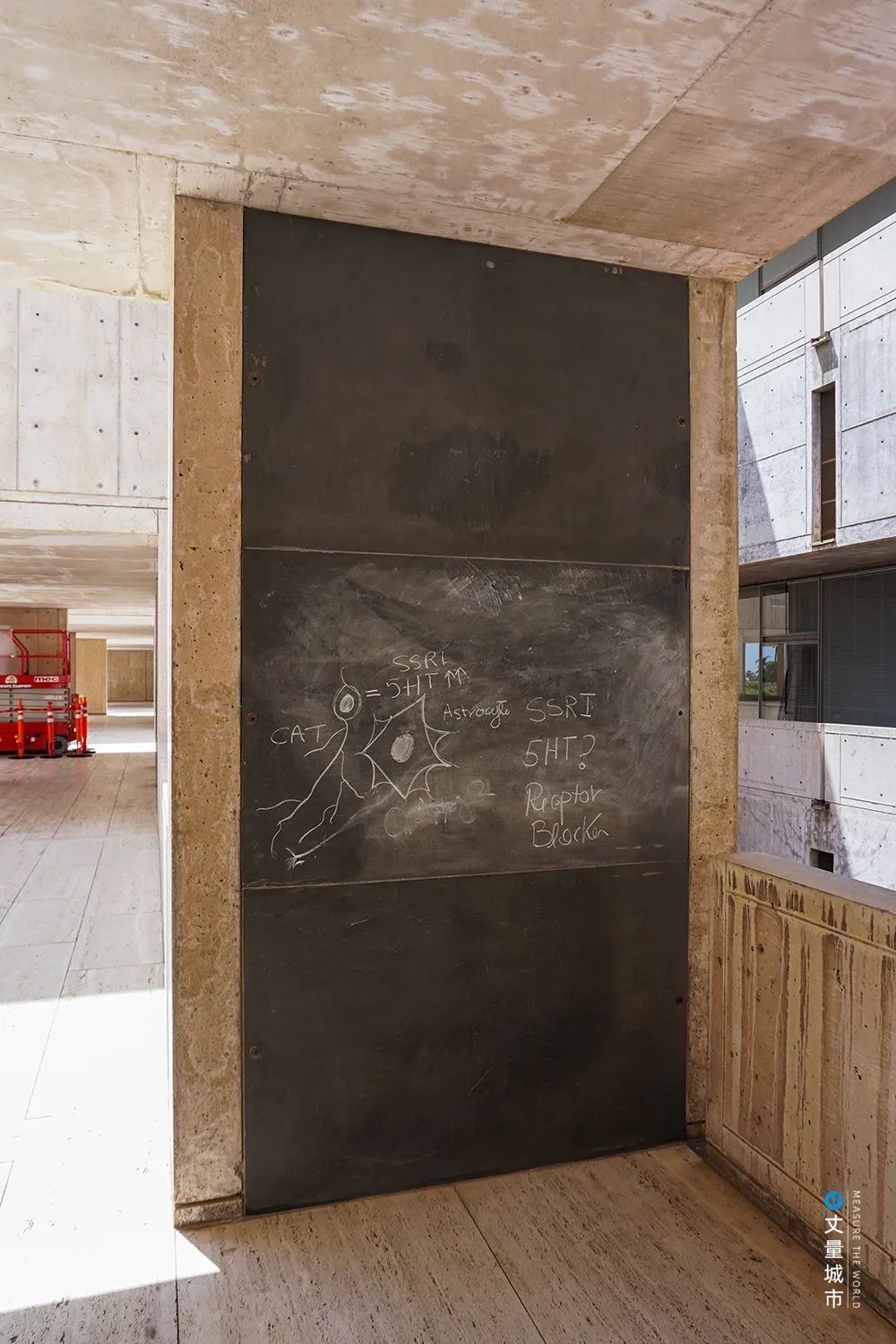 當初設(shè)計的用意就是希望能夠促進合作的氣氛。在長廊中,科學家們可以隨時停留下來進行「不經(jīng)意間的交流」——在墻上寫寫畫畫,留下思考的線索和問題。