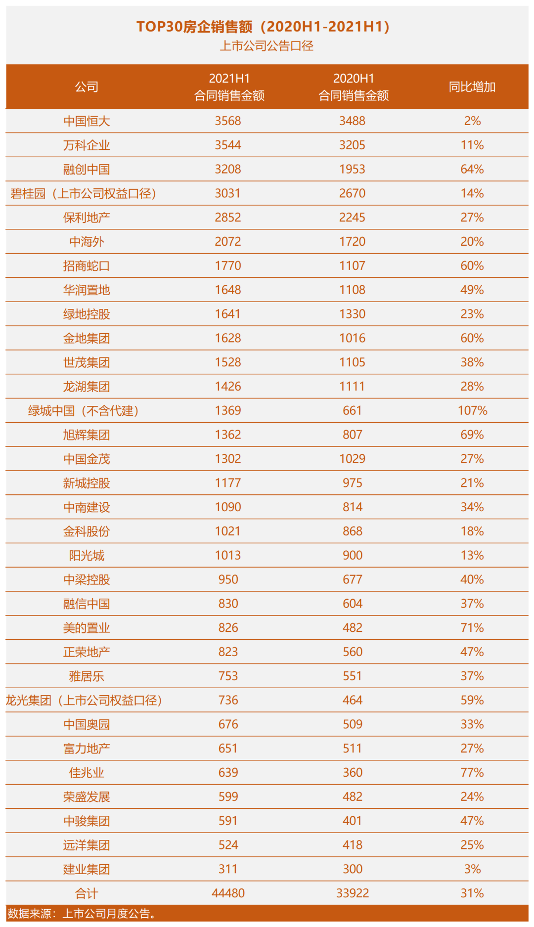 因為2020年上半年銷售受疫情影響,2021年同比銷售額增幅較大,全國增幅39%,TOP30房企增幅31%。
