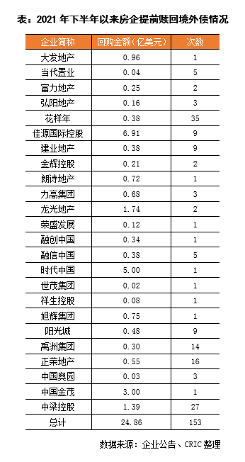 據(jù)不完全統(tǒng)計(jì),2021年下半年以來,不少于24家房企陸續(xù)實(shí)行境外債提前回購舉動(dòng),回購次數(shù)超過153次,提前回購境外債券及票據(jù)涉及資金合計(jì)24.86億美元,債券到期時(shí)間橫跨2021年到2026年,不少房企十月以后加大了2022年到期債務(wù)的提前贖回,減輕明年的還款壓力。就企業(yè)表現(xiàn)來看,中梁控股、正榮地產(chǎn)、禹洲集團(tuán)、花樣年等回購次數(shù)相對較多,佳源國際、中國金茂、中梁控股、龍光等贖回金額超過1億美元。房企進(jìn)行債券回購除了維穩(wěn)市場信心之外,也因當(dāng)前債券價(jià)格相對便宜,以低折扣進(jìn)行回購實(shí)則比到期兌付更為劃算。