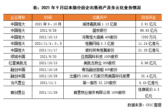 除了商廈、開發(fā)項(xiàng)目等資產(chǎn),企業(yè)還進(jìn)行多元化業(yè)務(wù)的出售。物業(yè)公司作為“現(xiàn)金奶?!彼貋碛休^高的估值,進(jìn)行現(xiàn)金回流的速度相對較高,成為部分房企考慮出售的多元化資產(chǎn)之一,今年以來,藍(lán)光、富力、當(dāng)代、紅星美凱龍等企業(yè)完成了其旗下物業(yè)公司的出售,回流現(xiàn)金。此外,部分企業(yè)也出售了對外投資企業(yè)的股份,如融創(chuàng)出售約1863.9萬股貝殼美國存托股票,回流金額約35.4億元,恒大母公司廣州凱隆減持嘉凱城1.13億股,收回現(xiàn)金2.91億元。也有部分企業(yè)聚焦主業(yè),出售旗下其他多元化業(yè)務(wù),如融創(chuàng)、綠城分別出售了部分游艇及科技業(yè)務(wù)。