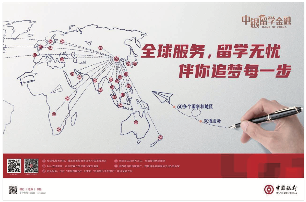 在跨境金融領域,中行始終保持行業領先,服務了全國大約50%以上的留學家庭。目前,中行設立了500多個覆蓋全國的跨境金融中心,并擁有覆蓋英、美、澳、加等60多個國家和地區的全球化服務網絡。