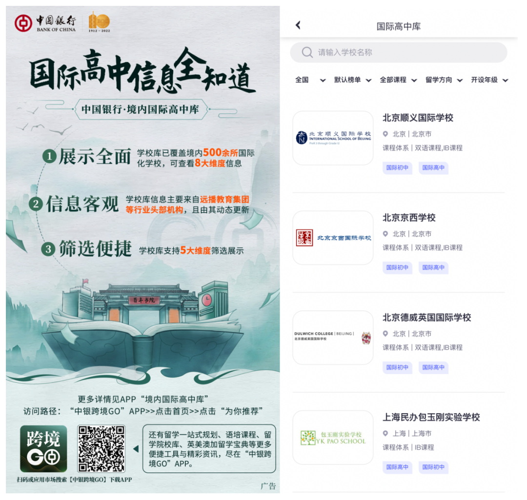 在留學規劃環節,“中銀跨境GO”打造市場獨家“境內國際高中庫”,首期優選全國范圍內的500余所國際化學校入駐,為國際化學校在讀家庭及擇校期家庭搭建信息全面、客觀、便捷的境內國際化學校信息平臺。中行還攜手福布斯中國定期發布“福布斯中國國際化學校排行榜”和“中國國際化學校教育指南”,致力于為家長提供更權威的信息和專業服務。