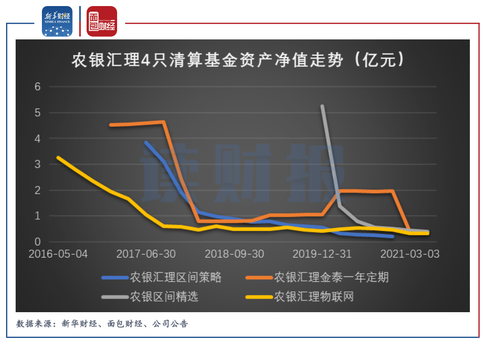 以清算起始日統計,2021年農銀匯理共有4只基金因資產凈值不足5000萬而進行清算,分別是“農銀匯理區間策略”、“農銀匯理物聯網”、“農銀區間精選”、“農銀匯理金泰一年定期”,其中前3個產品為混合型基金、第4個為債券型基金,且4個產品由個人投資者持有絕大部分份額。